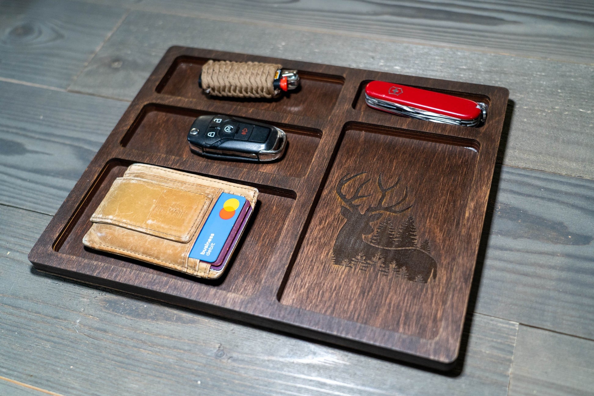 EDC Nightstand Dump Tray - Wood Valet Tray - Deer Engraving - Buck - Hunting