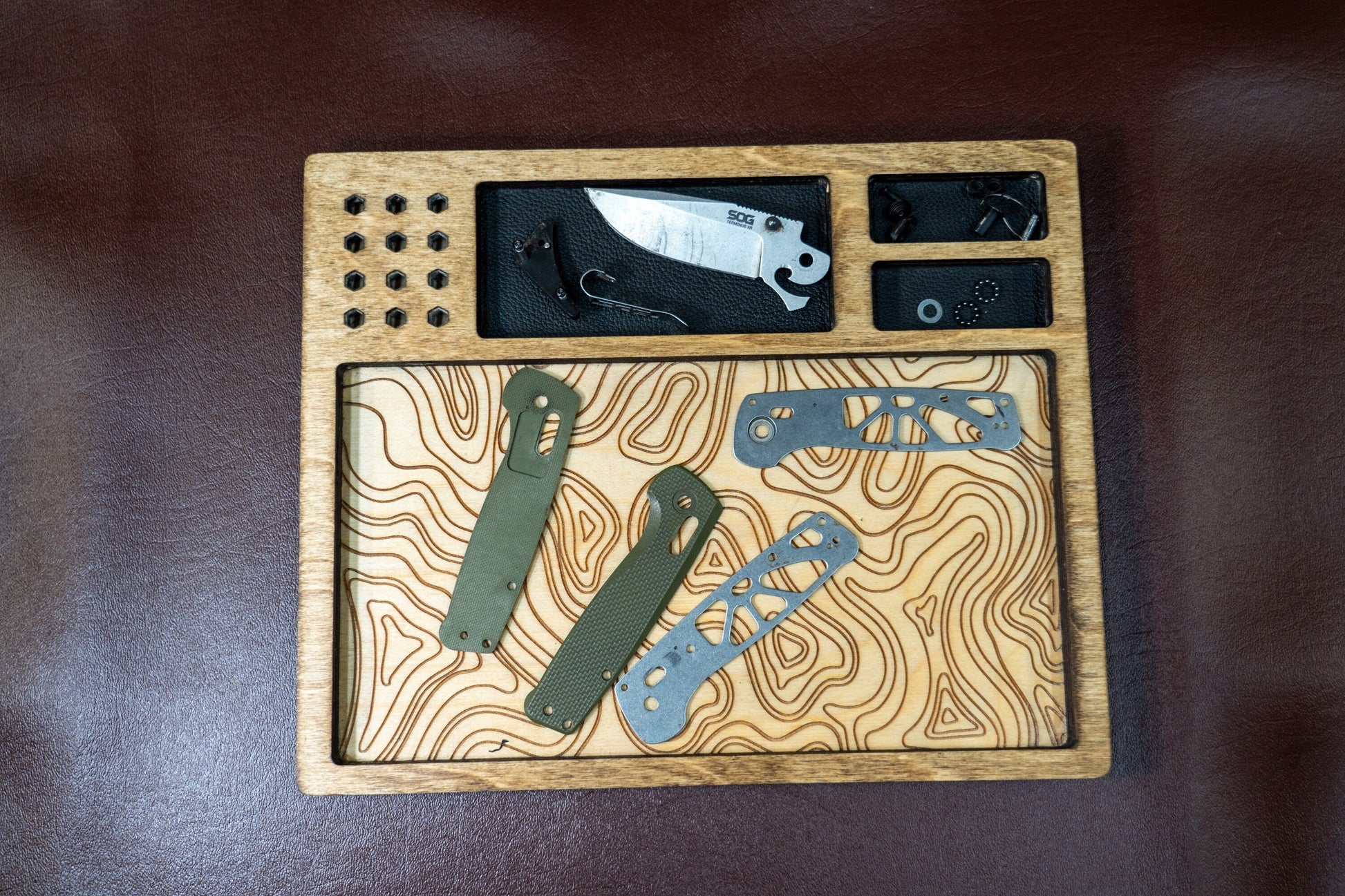 EDC Tray for Knife Maintenance - Black Leather and Topography